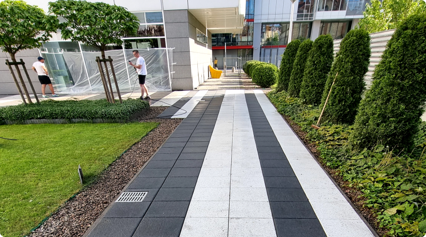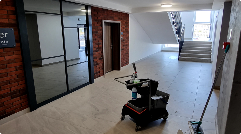 Systematyczne utrzymanie czystości klatek schodowych, wind i części wspólnych budynków.
